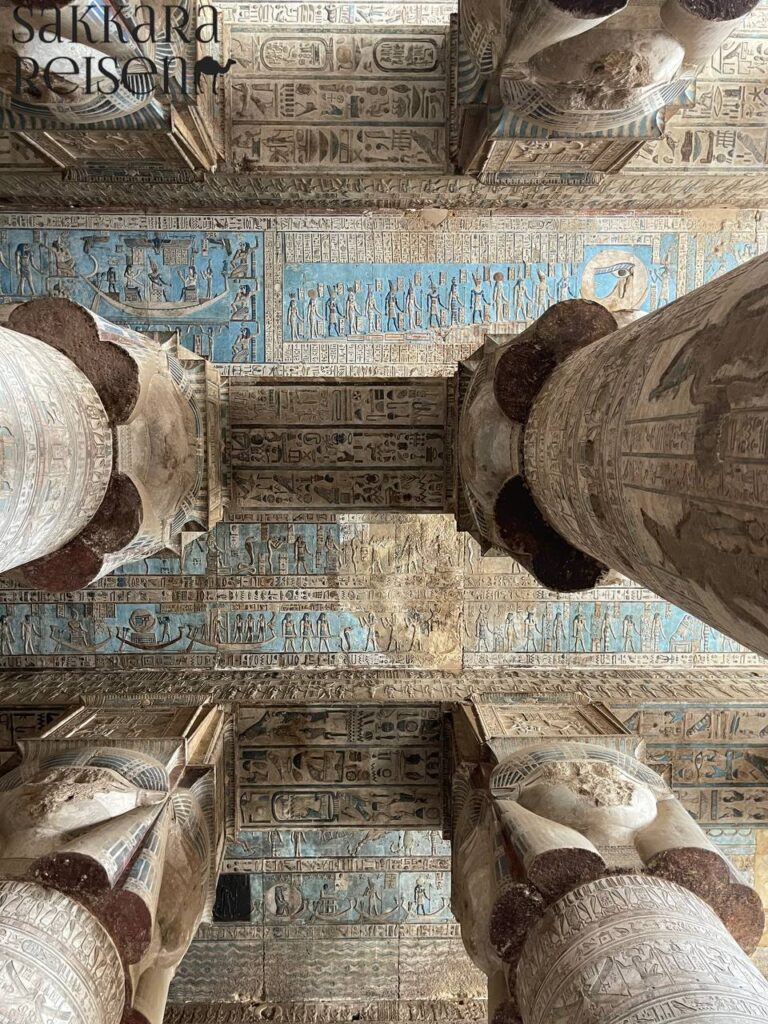 Zwischen dem Abydos Tempel und dem Tal der Könige liegt Dendera mit dem Tempel der Göttin Hathor, der Göttin der Liebe, der Freude und des Tanzes, dargestellt als heilige Kuh oder in Menschengestalt mit Kuhhörnern. Er ist einer der am besten erhaltenen Tempel Ägyptens und berühmt für die astronomischen Malereien und Reliefs des Alten Ägyptens. Die Darstellungen an den Decken zeigen Planeten, Sternzeichen und Mondphasen.