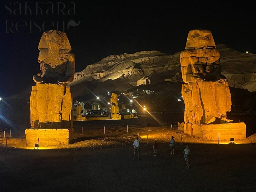 - Memnon-Kolosse – Kurzer Aufenthalt bei den Memnon-Kolossen, zwei riesige Sitzstatuen des Königs Amenophis III, eine mit seiner Ehefrau und die andere mit seiner Mutter zu seinen Füßen. Sie waren einst Torwächterstatuen des fast gänzlich zerstörten Tempels.