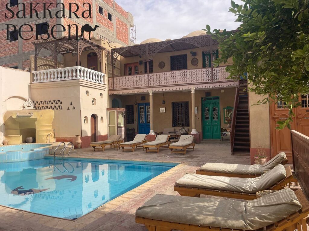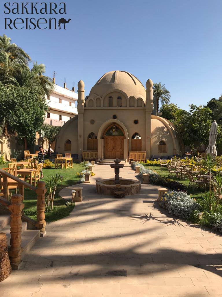 Habu Hotel – ist ein außergewöhnlich und elegant gestaltetes Hotel mit Außenpool und im Vintage Stil gestalteten Zimmer aber moderner Ausstattung. Es liegt direkt gegenüber des Habu Tempels und hat eine Dachterrasse mit Blick auf den Tempel und auf die Bergkette Thebens.