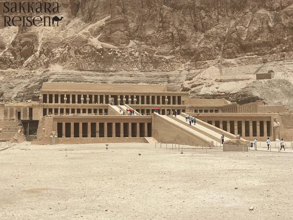 Im zweiten Teil können Sie die Terrasse des Tempels betreten, die kunstvollen Kolonnaden bewundern und die umliegenden Wadis überblicken. Die Kombination aus Geschichte, Kultur und Landschaft bietet ein tiefes emotionales Erlebnis. Hier verschmelzen Architektur, Symbolik und Natur, sodass der Besuch des Hatschepsut-Tempels nicht nur informativ, sondern auch inspirierend und spirituell bereichernd ist.