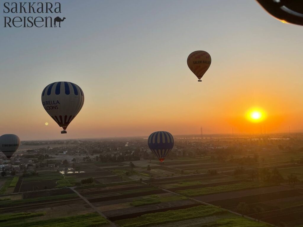 Die Heißluftballonfahrt bei Sonnenaufgang über Luxor bietet ein unvergleichliches Erlebnis, das die majestätische Landschaft der Tempel, den Nil und die umliegenden Wadis in warmes Morgenlicht taucht. Während Sie sanft über die historische Stadt gleiten, vermittelt Ihnen Ihr Pilot Einblicke in die Geografie und Geschichte der Region. Die Ruhe des Ballons kombiniert mit dem Panorama der antiken Stätten schafft ein tiefes Gefühl von Freiheit und Ehrfurcht.