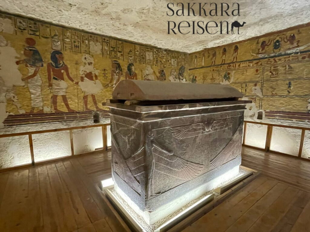 Dein erster Halt ist das Grab des Tutanchamun, dessen Entdeckung durch Howard Carter im Jahr 1922 die Welt erschütterte. Die originalen Wandmalereien, die den jungen Pharao auf seiner Reise ins Jenseits zeigen, sind noch immer leuchtend und detailreich. Anschließend besuchst du die Gräber von Ramses IV., Merenptah und Seti I., deren Reliefs und Hieroglyphen das ägyptische Verständnis von Ewigkeit, Schutz und göttlicher Ordnung widerspiegeln. Besonders beeindruckend ist die perfekte Erhaltung der Farben – ein Zeugnis der meisterhaften Handwerkskunst der altägyptischen Künstler.