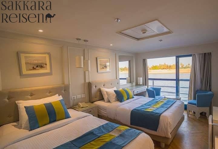 Die Kabinen sind großzügig gestaltet und bieten unterschiedliche Kabinenkategorien, von Standardkabinen über Suiten bis hin zu luxuriösen Deluxe-Räumen. Alle Kabinen verfügen über Panoramafenster oder private Balkone, die einen spektakulären Blick auf den Nil ermöglichen. Morgens erwachst du mit dem sanften Licht der aufgehenden Sonne, die sich im Wasser spiegelt, und kannst die vorbeiziehenden Dörfer, Palmenhaine und weiten Felder in Ruhe beobachten. Die durchdachte Raumaufteilung sorgt dafür, dass sowohl Paare als auch Familien genügend Platz und Privatsphäre genießen.