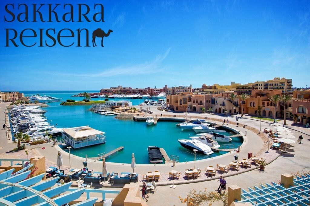 Während der Stadtrundfahrt durch die Inselwelt entdecken Sie die harmonische Verbindung von Architektur, Natur und moderner Infrastruktur. Ein Höhepunkt ist die Freizeit im Down Town, wo Sie das orientalische Flair genießen, in den Boutiquen shoppen oder einen traditionellen ägyptischen Tee in gemütlichen Cafés probieren können. Der Spaziergang an der Abu Tig Marina zeigt internationale Luxusyachten und schafft unvergessliche Fotomomente. Vom Aussichtsturm aus eröffnet sich ein Panorama, das Lagunen und Wüste in einzigartiger Harmonie zeigt – perfekte Kulisse für Erinnerungsfotos.