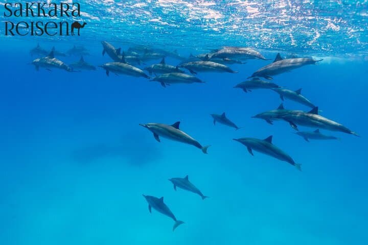 Das Schwimmen mit freilebenden Delfinen gehört zu den emotionalsten Erlebnissen im Roten Meer. Früh am Morgen startet der Bootsausflug ab Soma Bay in ausgewiesene Schutzgebiete, in denen Delfine in ihrer natürlichen Umgebung leben. Der respektvolle Umgang mit den Tieren steht dabei stets im Mittelpunkt. Erfahrene Guides informieren ausführlich über Verhalten, Sicherheit und den achtsamen Kontakt im Wasser. Sobald Delfine gesichtet werden, erfolgt der Einstieg kontrolliert und ohne Hektik.