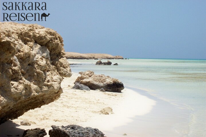 Nach dem ersten Schnorchelerlebnis legt das Boot an der ersten Hamata Insel an, wo Sie barfuß einen Strand betreten, der wie aus einem Traum wirkt. Der feine weiße Sand, das leise Rauschen des Meeres und die völlige Abgeschiedenheit schaffen einen Moment tiefer Ruhe. Hier gibt es keine Hotels, keine Straßen – nur unberührte Natur, Wind, Sonne und das rhythmische Atmen des Meeres. Sie haben Zeit, die Insel in Ihrem eigenen Tempo zu erkunden, entlang der Küste zu spazieren oder einfach im Schatten zu verweilen und die Stille auf sich wirken zu lassen.