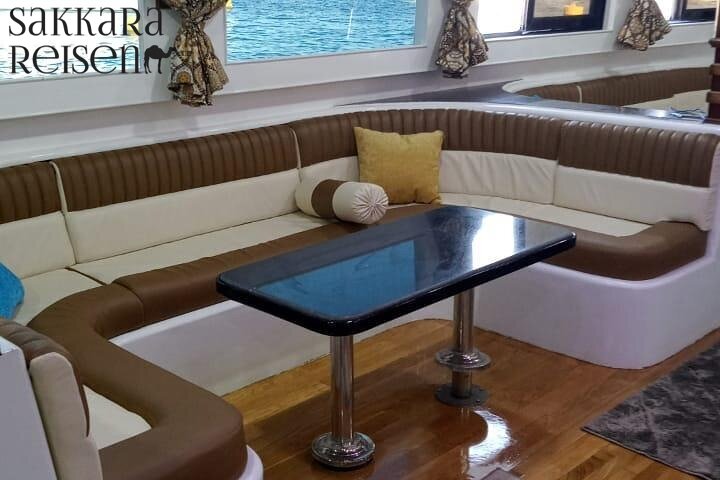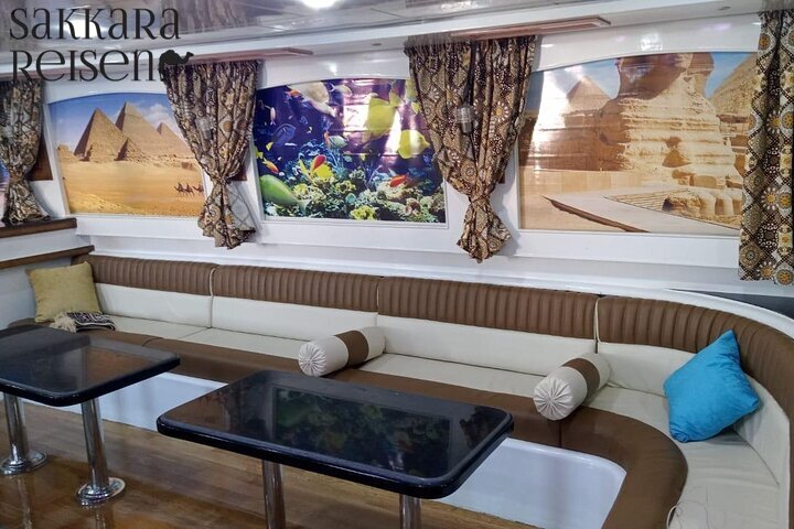Zur Mittagszeit kehren Sie zurück an Bord, wo ein frisch zubereitetes Mittagsbuffet für Sie bereitsteht. Während das Boot ruhig vor Anker liegt, genießen Sie Ihre Mahlzeit mit Blick auf die Lagunen des Roten Meeres und die sanft schaukelnden Wellen. Die Kombination aus warmem Essen, frischer Meeresluft und der Weite des Horizonts macht diese Pause zu einem genussvollen Moment der Entspannung.